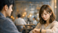 カフェで向かい合う女性がやさしい眼差しを向け、背後の男性がその視線に戸惑いながら惹かれていく瞬間を切り取った一枚。 恋愛-男性向け